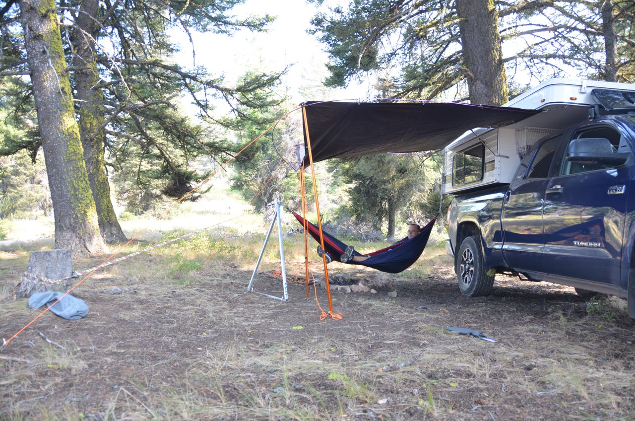 (5) A double hammock (from Amazon) that hooks to one corner of the camper, courtesy of Home Depot: A steel L-bracket bolted onto the camper’s jack bracket suspends a 1-ft. chain with a snap-hook carabiner; connected to the chain is a 2-ft. yellow tow-strap that is hooked with a matching carabiner on the other end to the truck’s frame underneath the bumper. The hammock connects with an S-hook to any link in the chain.