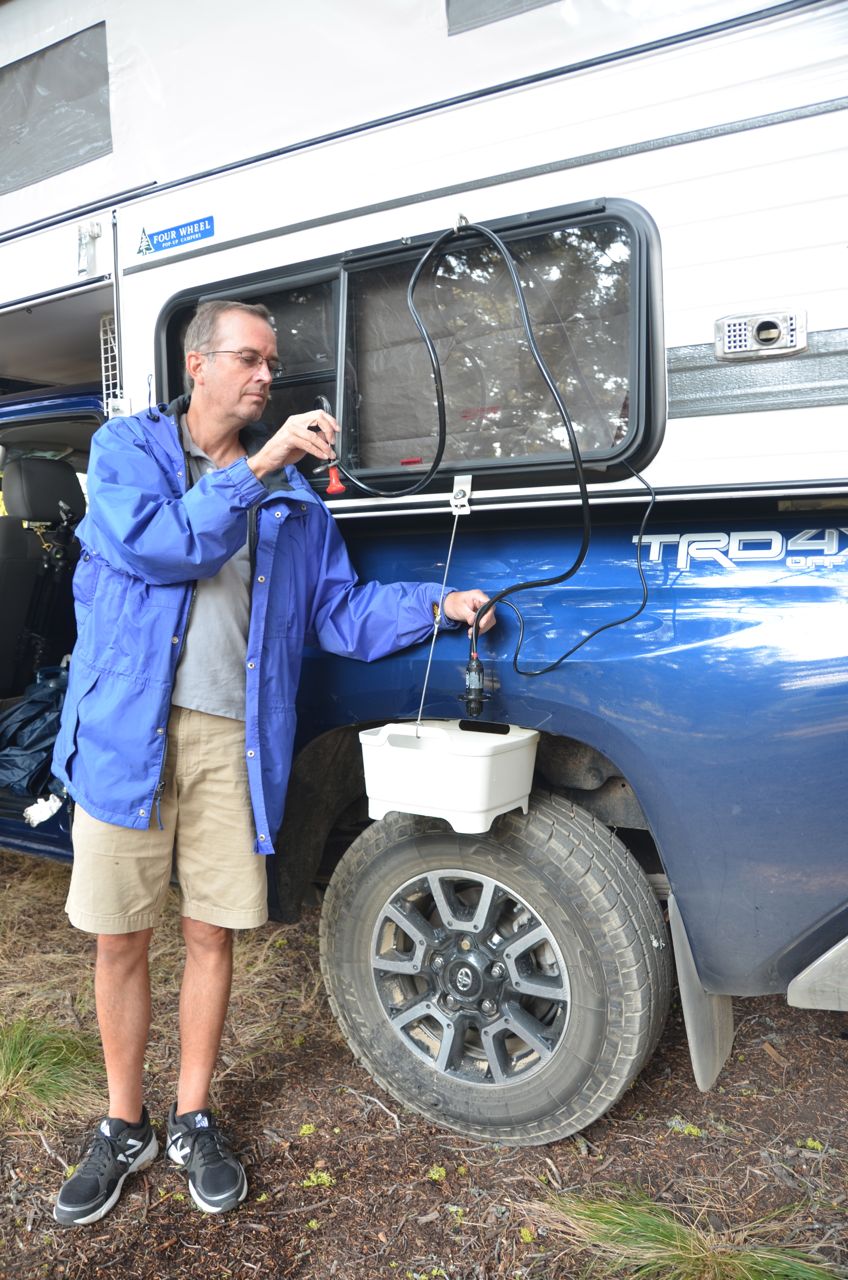 (1) After experiencing the delight of an outdoor shower in Cape Cod many years ago, I devised my own, powered by a 12-volt Zodi pump (from Amazon) submerged in a portable 1-gal. sink (from Amazon) full of stove-heated warm water, with the power cord threaded through the open window and plugged into a 12-volt receptacle. The back corner feet of the sink fit nicely into the tire treads, which stabilize the sink. The front of the sink is suspended by a wire that hooks on the window sill. After you spray yourself with the shower head you drop it into the sink, allowing the water to recirculate until you spray yourself again. In this way a 1-gallon shower can last 10 minutes:
