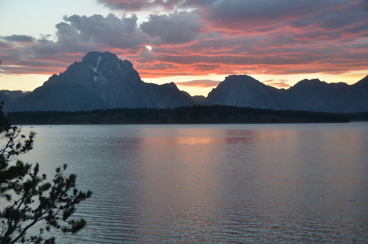 My preparations delayed my departure from Boise until about noon, and I arrived at Grand Teton National Park at about 6 PM. I was surprised to hear from the ranger that all campgrounds in the park were full but one. Last year at this time I had no trouble finding a campsite at Signal Mountain Campground. Today I had to drive to the northernmost Flagg Ranch, about 25 miles north of Signal Mountain. They had four campsites left at 8 PM, so I grabbed one for $20, after a 50 percent discount with the annual national park pass. At 9 PM it’s 67 degrees, a lot warmer than last year. Anyway, I did take a few shots of the Tetons at sunset:
