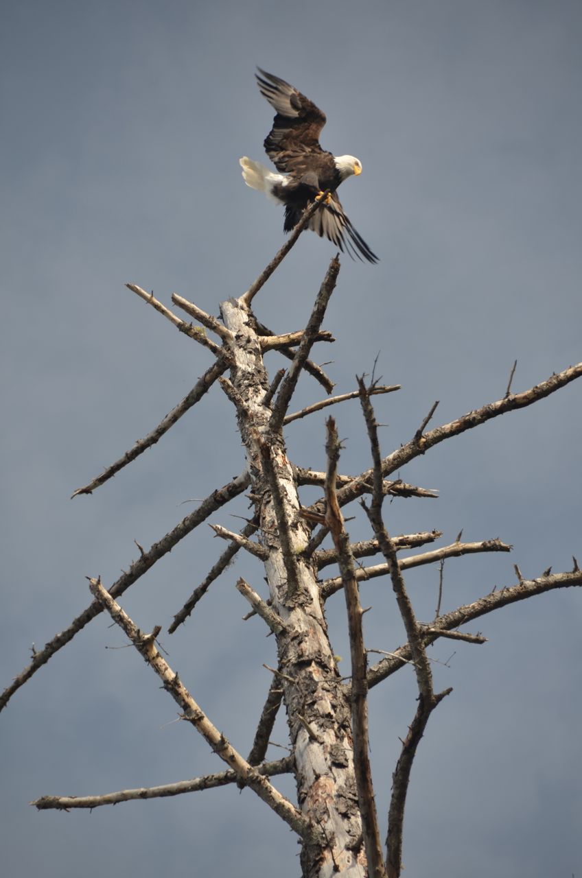 Baldy2Well, not directly above me, as I even saw the eagle poop after it landed on the tree, but it missed me.  I almost took the poop shot, but I hesitated with the sudden feeling that such a photo would be too undignified for our national bird… Now I regret not capturing the moment for posterity, or just for the record, just as I regret not shooting the bear I faced on the lake shore at Glacier before seeking higher ground. Baldy2Flying