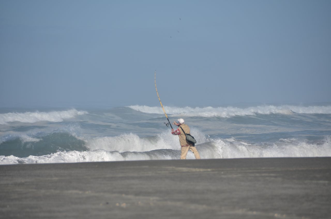 BeachFishing… and ended up at Gold Bluffs Campground, right on the sunny beach within the Redwoods National Park.  (The angler shown here tried fishing for 15 minutes and then gave up and walked back to camp.)