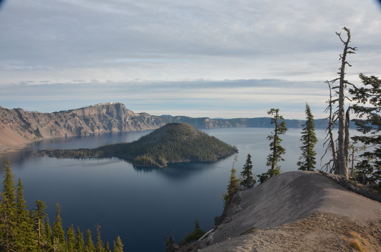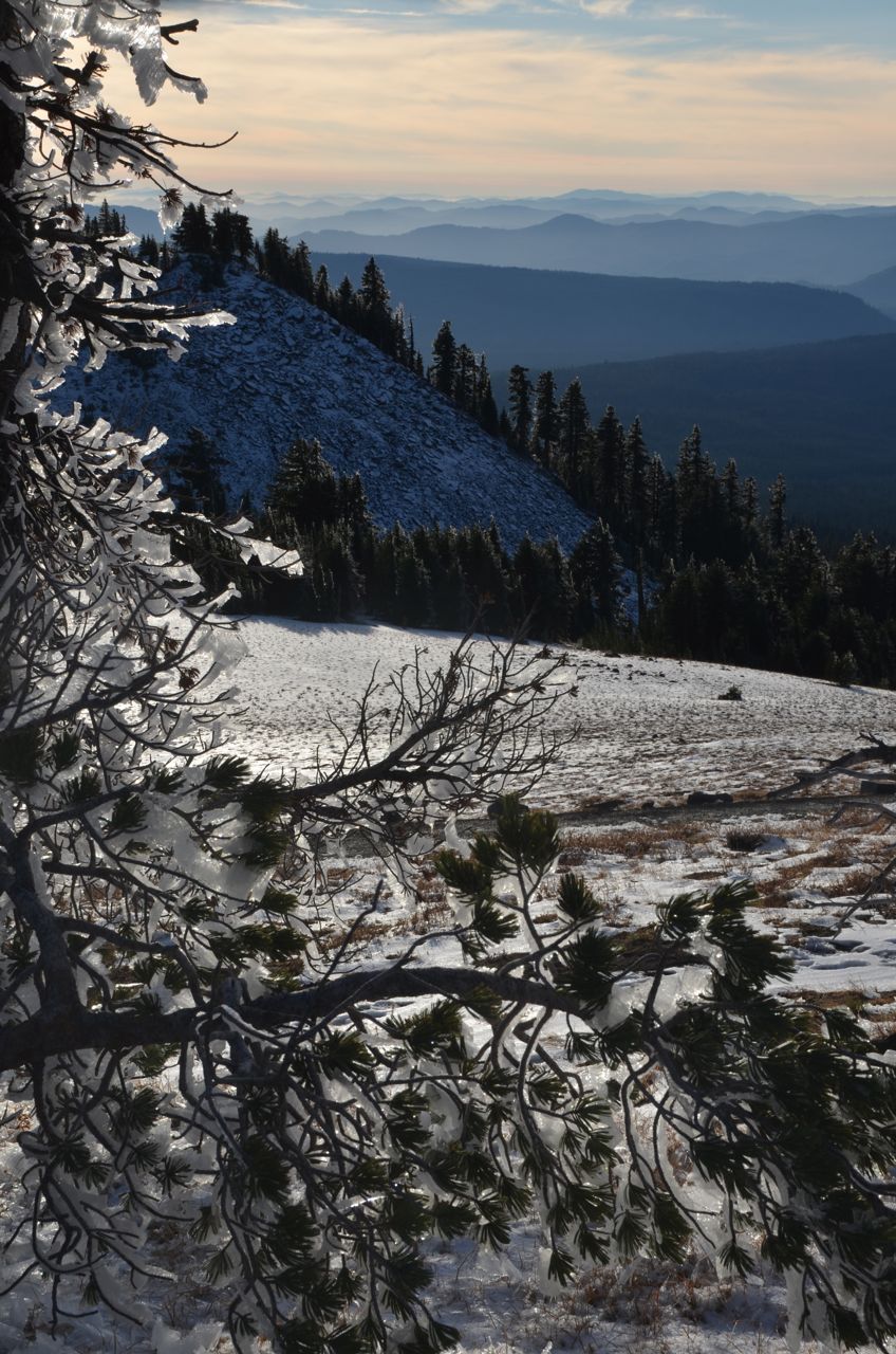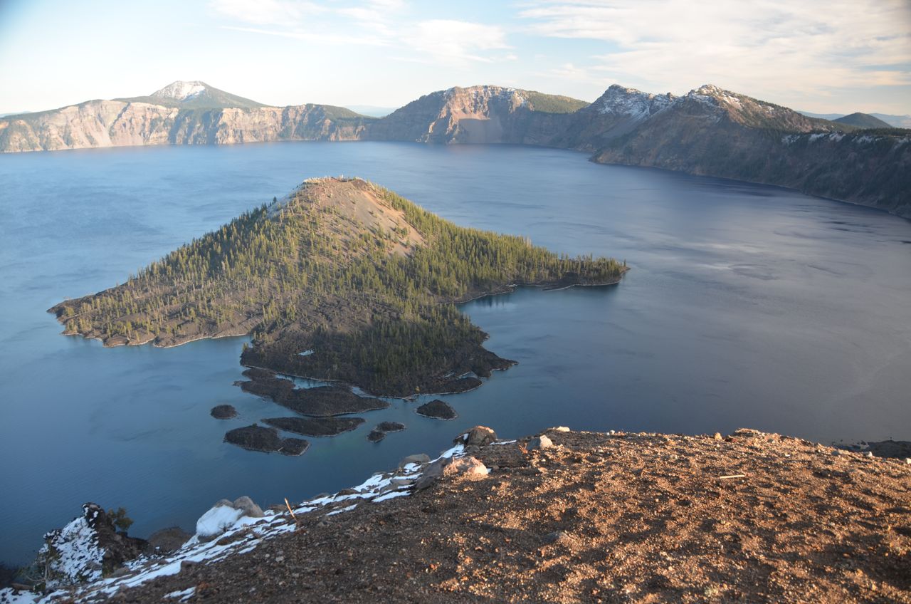 I thought of staying another night, but the dunes were boring, so I got a wild hair and headed out the next morning for a long, mostly uphill drive to Crater Lake, arriving at the volcano’s rim road in late afternoon, where it was cold and windy…