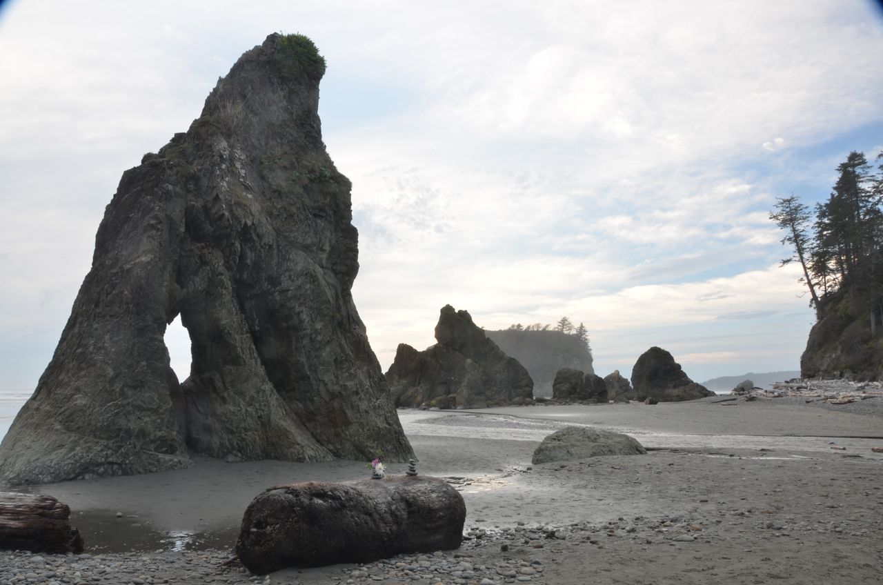 I stayed another night, hoping for a clear sunrise, but it was overcast and cold, so I headed south to Ruby Beach, another (popular!) Olympic National Park coastal area.  The beach was crawling with visitors, and I waited a long time for everyone to walk out of my field of view, which lasted only seconds; one couple ended up enhancing the shot, I think: