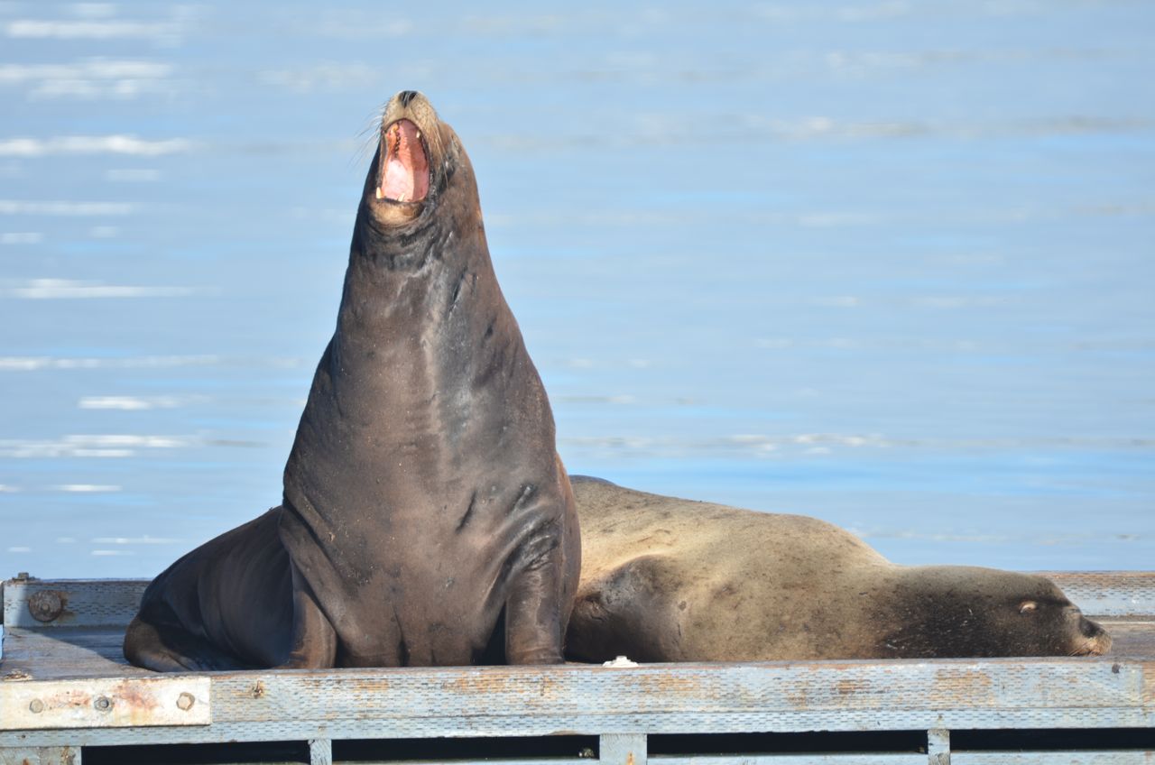 Then I drove to Crescent City, CA, near Redwoods National and State Parks, got advice from the ranger (the one who accurately predicted rain) at the park information center, and camped at the northernmost campground (Jedediah Smith Redwood State Park Campground), where it rained that night. The next morning I drove back to town and worked on my blog at Starbucks, then started exploring the areas recommended by the ranger, where I caught a sea lion yawn, and elk grazing in the distance, both shot with the 600mm zoom lens: