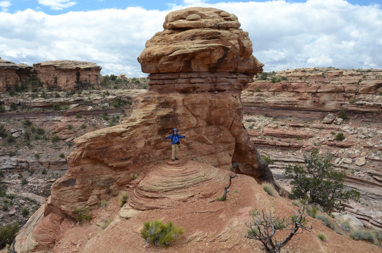 We got wet, and so did his tent, we just couldn’t pack up fast enough before the deluge. We drove to Moab for lunch, about 30 minutes away, on our way to Canyonlands NP. The campsites at the park’s Squaw Flat campground were all booked and no one had vacated even after repeated heavy rains, so we had to camp at a commercial site called Needles Outpost. But it was just outside the park boundary at the Needles entrance, and the manager was a friendly hippie plumber who’d been on the job only a week, so he was still happy and eager to please. And we liked the price ($15 total, same as the BLM sites without the senior discount), with privacy and scenery, so we draped Gordon’s tent over my awning poles to dry and ended up staying two nights: