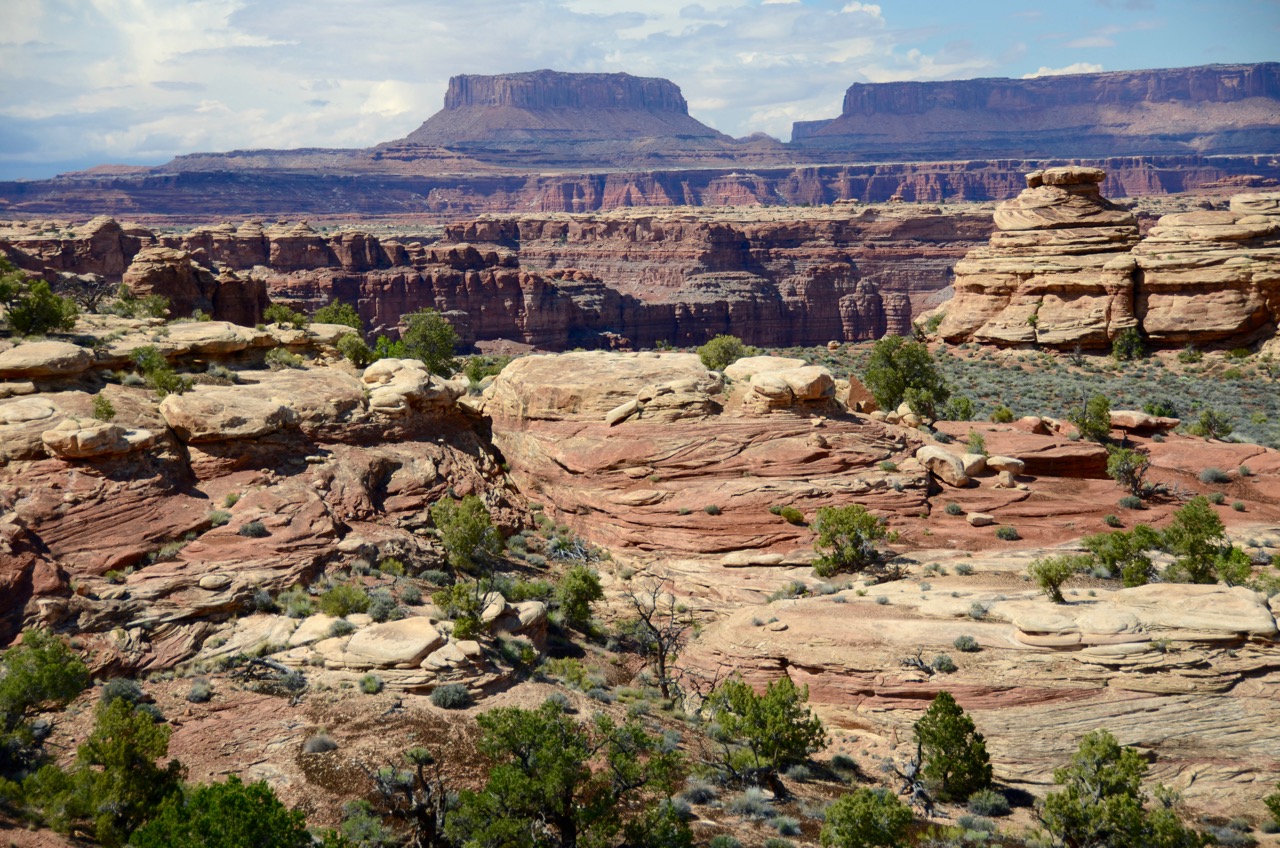We drove to the end of the Needles District road and found a parking space on the side of the road, along with a throng of other tourists. We hiked a couple of hours on the Big Spring Canyon Overlook and on the Slickrock Foot trails, much of it under rain or the threat of it:
