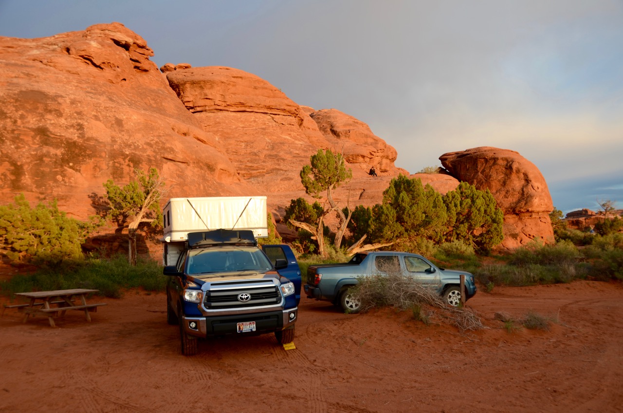 I didn’t even bother to enter Arches NP, but turned east on Rte. 128 just south of Arches, which followed the Colorado River for a few miles. At about 4 miles in I lucked out: I arrived at noon at a riverfront BLM campground called Hal Canyon, just as a British camper and his kids were packing up from the largest and best campsite I’d seen so far (Site #11). “I left some firewood, too,” he said in that charming accent. I grabbed it, reserving it for 2 nights, with an option for a third if everyone liked it. It had a level pad for my truck and room enough for two more cars to park, and it had a river view. It cost us only $7.50 per night with my lifetime senior discount. John arrived the next day and stayed three nights, remarking on my luck. Gordon arrived the next day, also impressed.