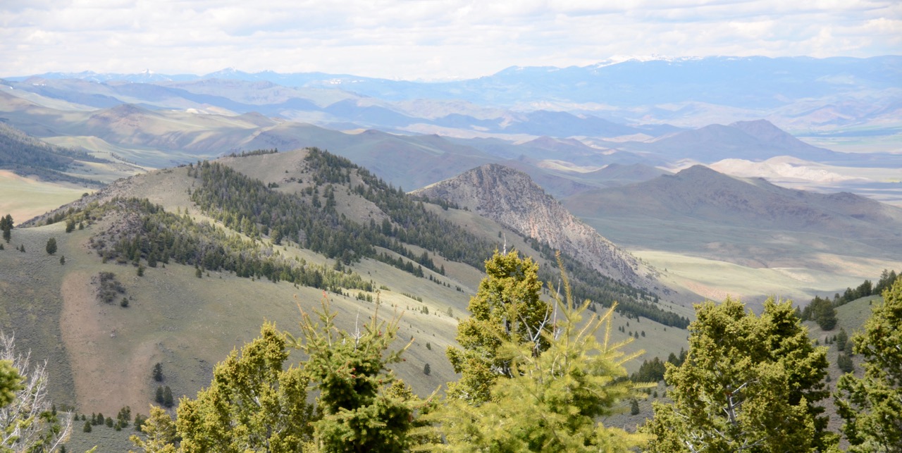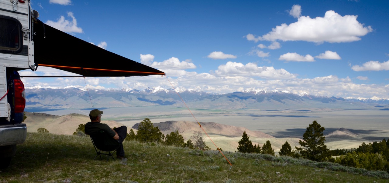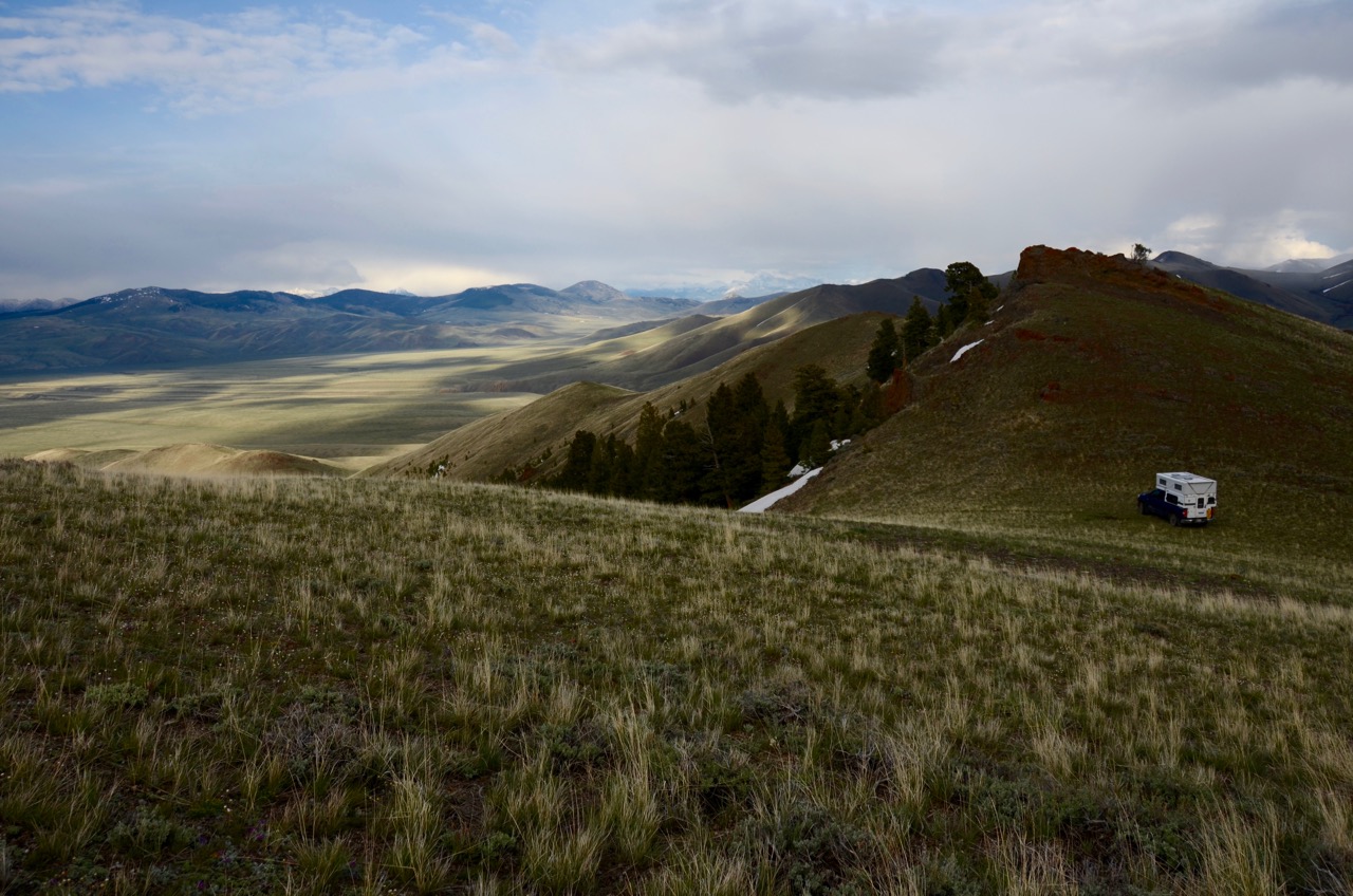 I parked, deployed the side awning, ate lunch, and hiked about an hour to the top of the ridge, another thousand feet, which gave an outstanding view of the Pahsimeroi River Valley below me to the northeast, the Lemhi Range mountains on the far side of the valley, and Grouse Creek Mountain directly behind me to the west: