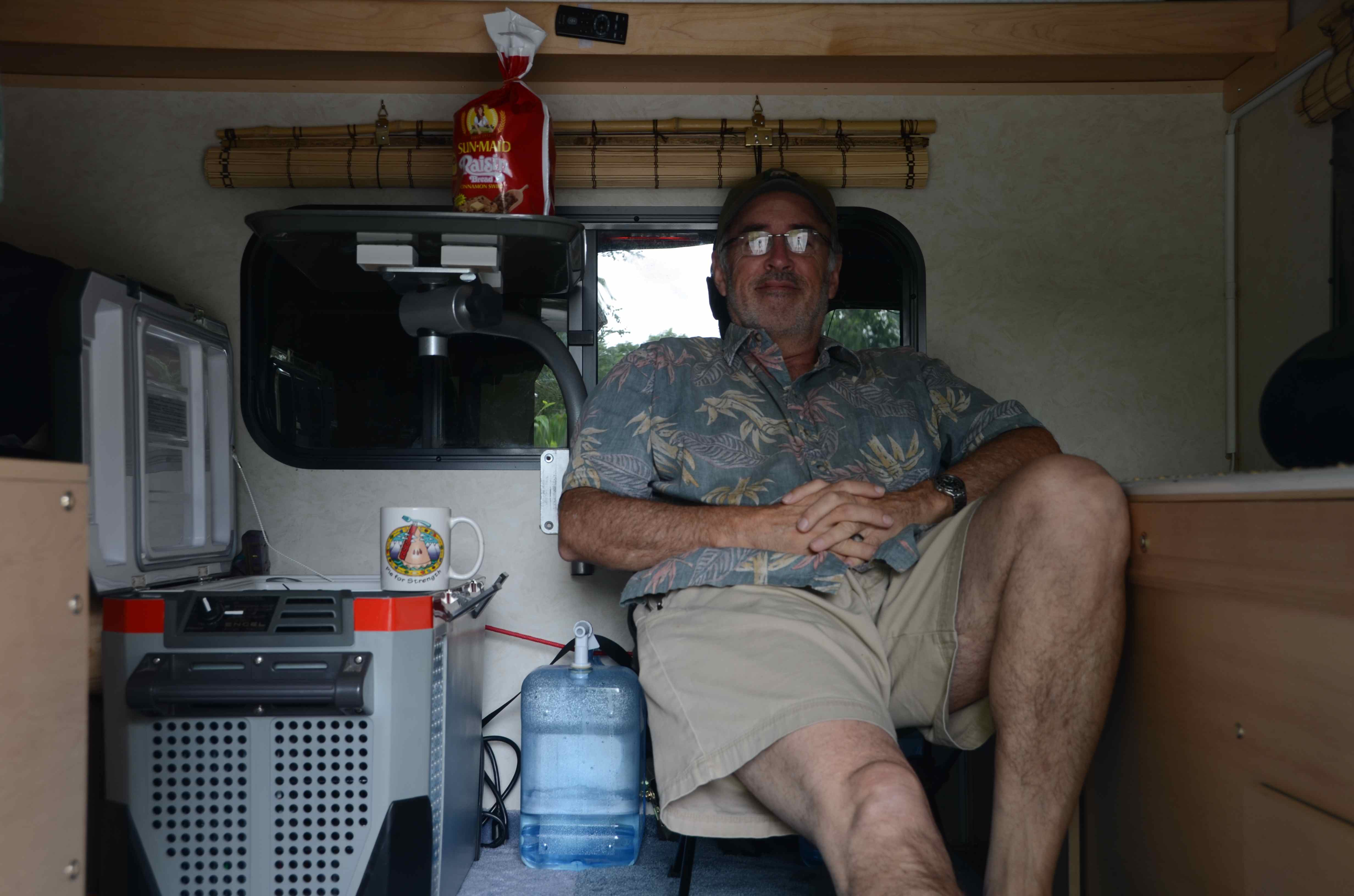 I researched trailers and campers for years and decided I wanted something I could take on any road without having to deal with more wheels hitched behind my truck, especially when backing up. I ordered this model when I visited the factory near Sacramento in June 2014, and paid $12,000 for it. I took delivery on Sept. 15, 2014. The delivered dry-weight was 1,100 lbs. I ordered the more basic “shell” model because I wanted to customize it with a few DIY ideas, and save a lot of money and weight, and put my “signature” on it. I did order some factory essentials, the most prominent being a stove and furnace and dual auxiliary marine batteries.