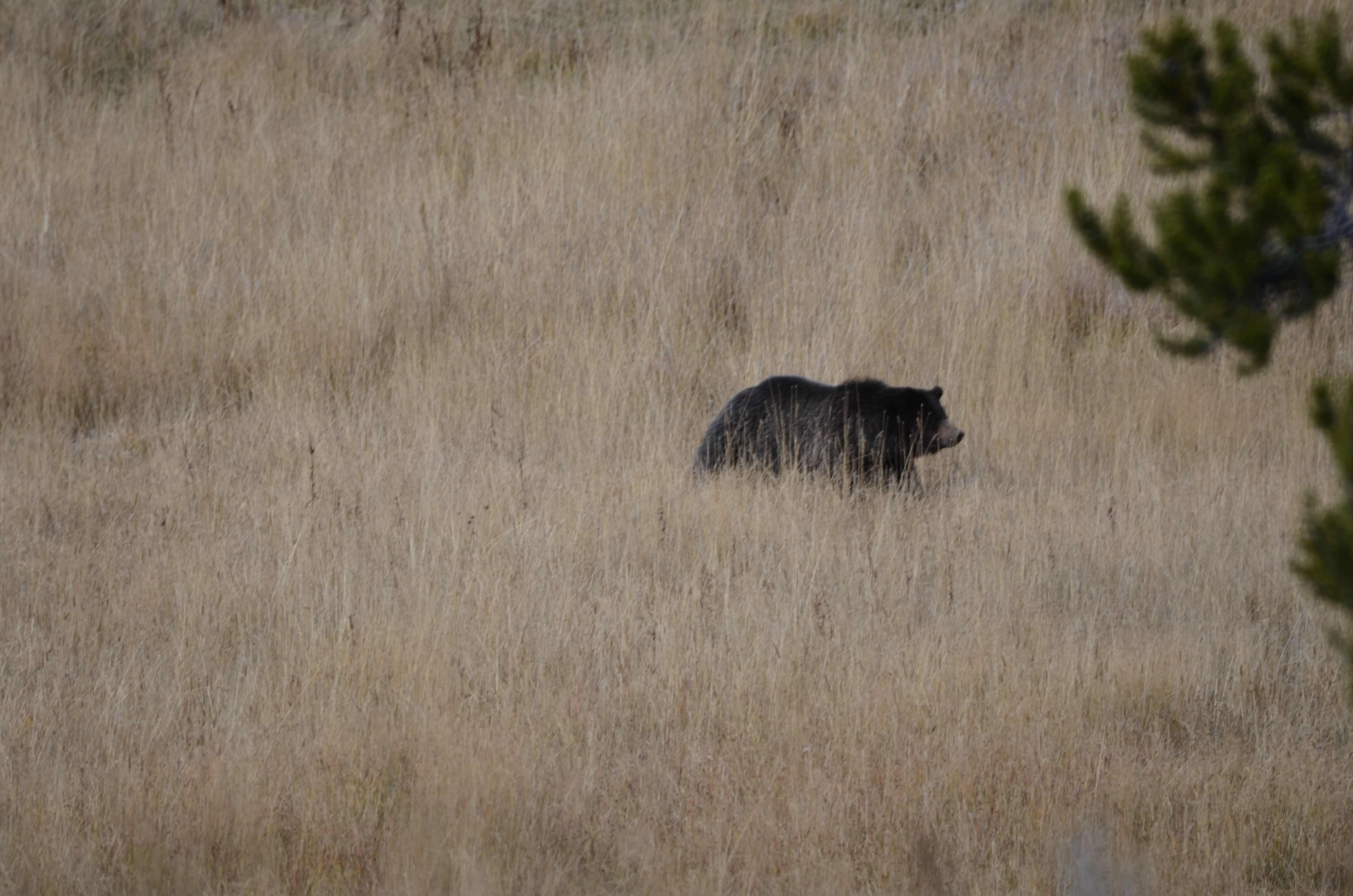 October 18, 2014 (Saturday): My fingers were freezing after shooting the Tetons at sunrise, so I dawdled in the lodge lobby at Grand Tetons NP for a few minutes to warm up and loaded camera backs with film, then headed north to Yellowstone. My first goal was the Lower Falls of the Grand Canyon of the Yellowstone. I got to the side-road for it, and saw that a bunch of cars were parked on both sides of the road, and about 20-30 people were standing with a ranger looking into a meadow. About 200 yards away was a 300-lb. female grizzly gorging herself on the meadow in preparation to hibernate. It was my first opportunity to use my observation platform, so I climbed up to my roof with my tripod and camera and had a view above the heads of the other gawkers. At that distance, even with a 500mm lens, the bear was pretty small in the frame, and the tall grass often obscured her as she was lolling about. But I shot my first grizzly: